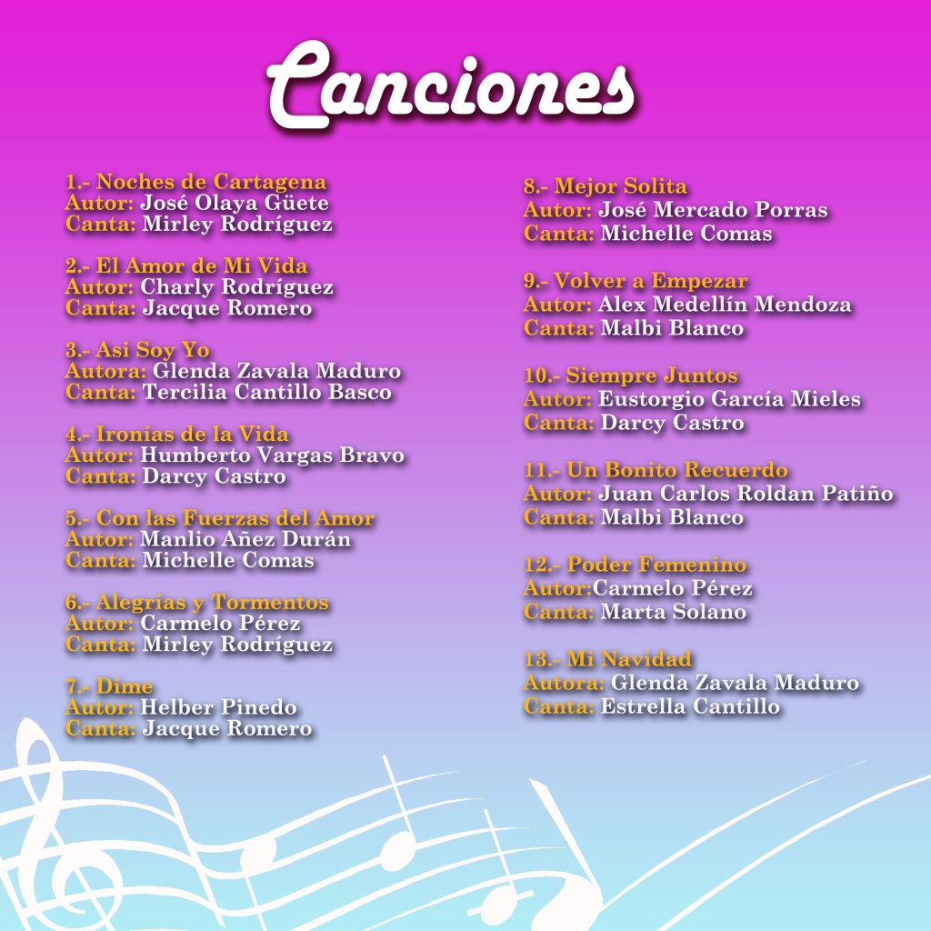En la segunda Producción Musical con un total de 13 canciones en diferentes estilos musicales, de la cual hicieron parte 11 compositores: Alex Medellín, Carmelo Pérez, Charly Rodríguez, Eustorgio García, Helber Pinedo, Glenda Zavala, Humberto Vargas, José Mercado Porras, José Olaya, Juancho Roldán y Manlio Añez. Complementándose con el talento de las cantantes Monita Castro, Estrella Cantillo, Malbi Blanco, Marta Solano, Michelle Comas, Mirley Rodríguez y Jacque Romero. La Producción fue realizada en los estudios del maestro Helber Pinedo en la Ciudad de Montería- Córdoba.