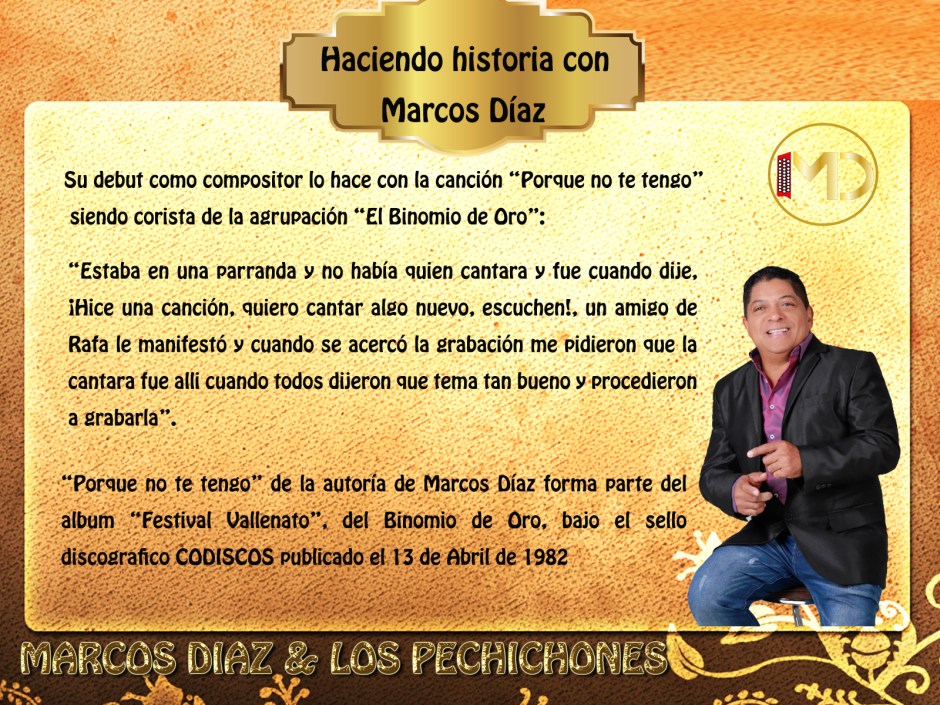 Marcos Díaz, comenzó a hacer historia desde su paso como corista del Binomio de Oro, logrando estar por espacio de ocho años como el corista principal al lado del gran Rafael Orozco, como corista también estuvo con los Hermanos Zuleta, Diomedes Díaz y Beto Zabaleta, por mencionar algunos.