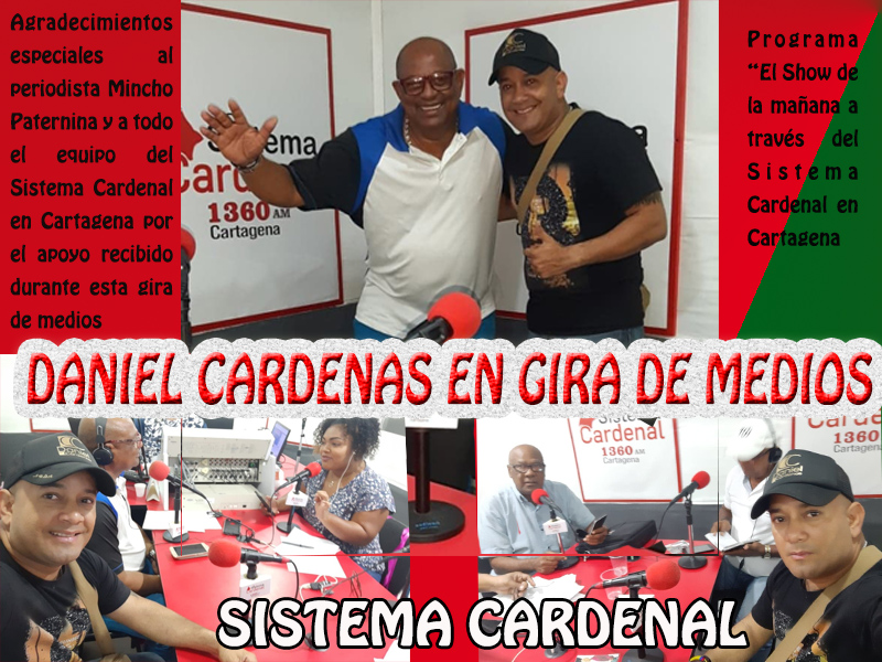 Agradeciendo de manera especial al Sistema Cardenal Cartagena 1360 quien lo recibió en la programación del reconocido locutor Mincho Paternina en su programa «El Show de la mañana» donde a traves de una entrevista se dio a conocer su trayectoria y los proyectos musicales que en este momento lidera Daniel Cardenas.