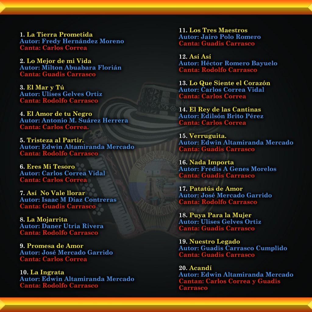 Los compositores que hacen parte de esta producción son los siguientes: Fredy Hernández, Milton Abuabara, Ulises Gelves, Antonio María Suarez, Edwin Altamiranda «Makina», Carlos Correa, Isaac Díaz, Daner Utria, José Mercado, Jairo Polo, Héctor Romero, Carlos Correa, Edilson Brito, fredis Genes, Guadis Carrasco. Los cantantes participantes son: Carlos Correa, Guadis Carrasco y Rodolfo Carrasco y los acordeoneros Cristian Álvarez y Oswaldo Morelos .