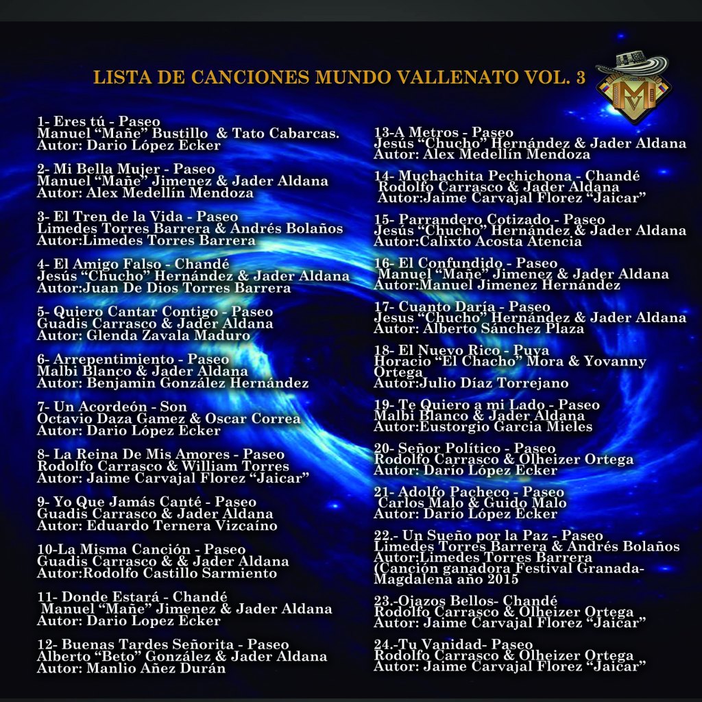 Con grandes expectativas se realizó el lanzamiento de la tercera producción de Mundo Vallenato Vol. 3 contando con una masiva participación de compositores, cantantes y acordeoneros quienes interpretaron canciones vallenatas en sus distintos aires musicales, logrando así un compendio de melodías, voces y sobre todo el sentimiento y las vivencias que reflejan cada una de las obras musicales.